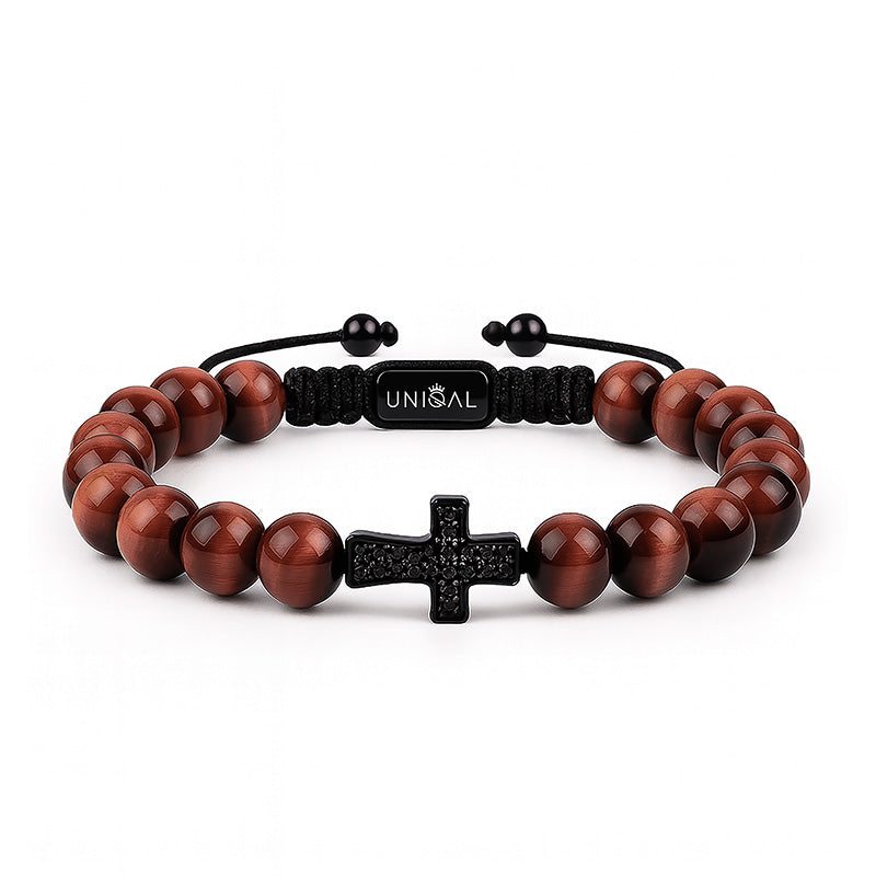 Edelsteinarmband „Tiger Power“ – Rotes Tigerauge & Black Zirkonia Kreuz • 8 mm Naturperlen