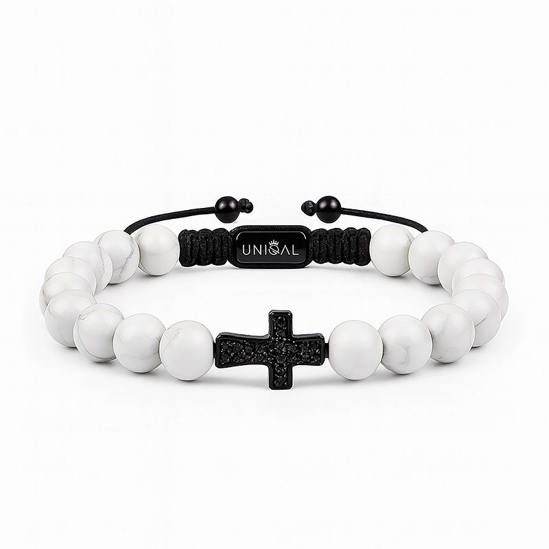 Die Kombination aus weißen Howlite-Perlen mit feinen grauen Adern und dem tiefschwarzen Kreuz erzeugt einen modernen, stilvollen Kontrast – minimalistisch, klar und elegant.