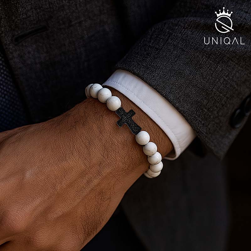 Dieses handgefertigte Armband kombiniert die harmonische Eleganz von White Howlite mit der markanten Ausdruckskraft eines schwarzen Kreuzes aus Edelstahl, besetzt mit feinen Zirkonia-Steinen. Ein Accessoire für Männer, die innere Ruhe, Stil und Ausstrahlung vereinen wollen.