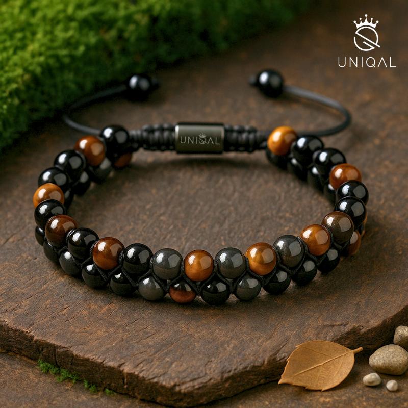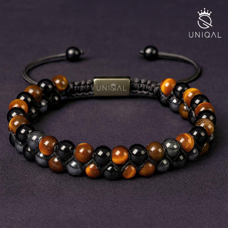 Le port de ce bracelet relie le porteur aux énergies profondes et guérissantes de l'hématite, de l'œil de tigre et de l'onyx. Il offre protection et ancrage, soutient la guérison émotionnelle et favorise la force intérieure et la clarté. Chaque regard sur les perles scintillantes rappelle qu'on peut traverser la vie avec courage, sérénité et un cœur ouvert.