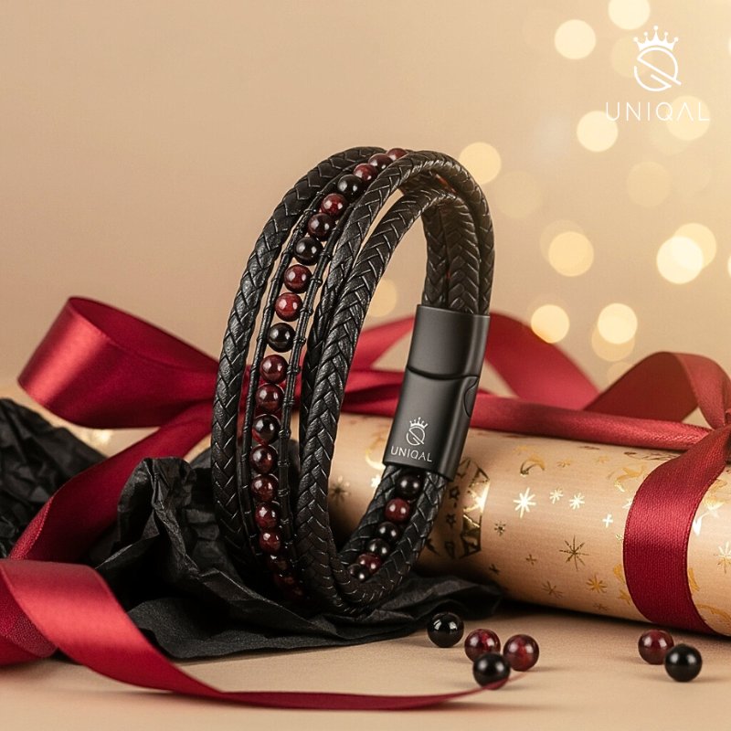 Design unique : Quatre brins de cuir tressés entourent une rangée de pierres fines en œil de tigre rouge, ce qui confère à ce bracelet une élégance et une sophistication incomparables.